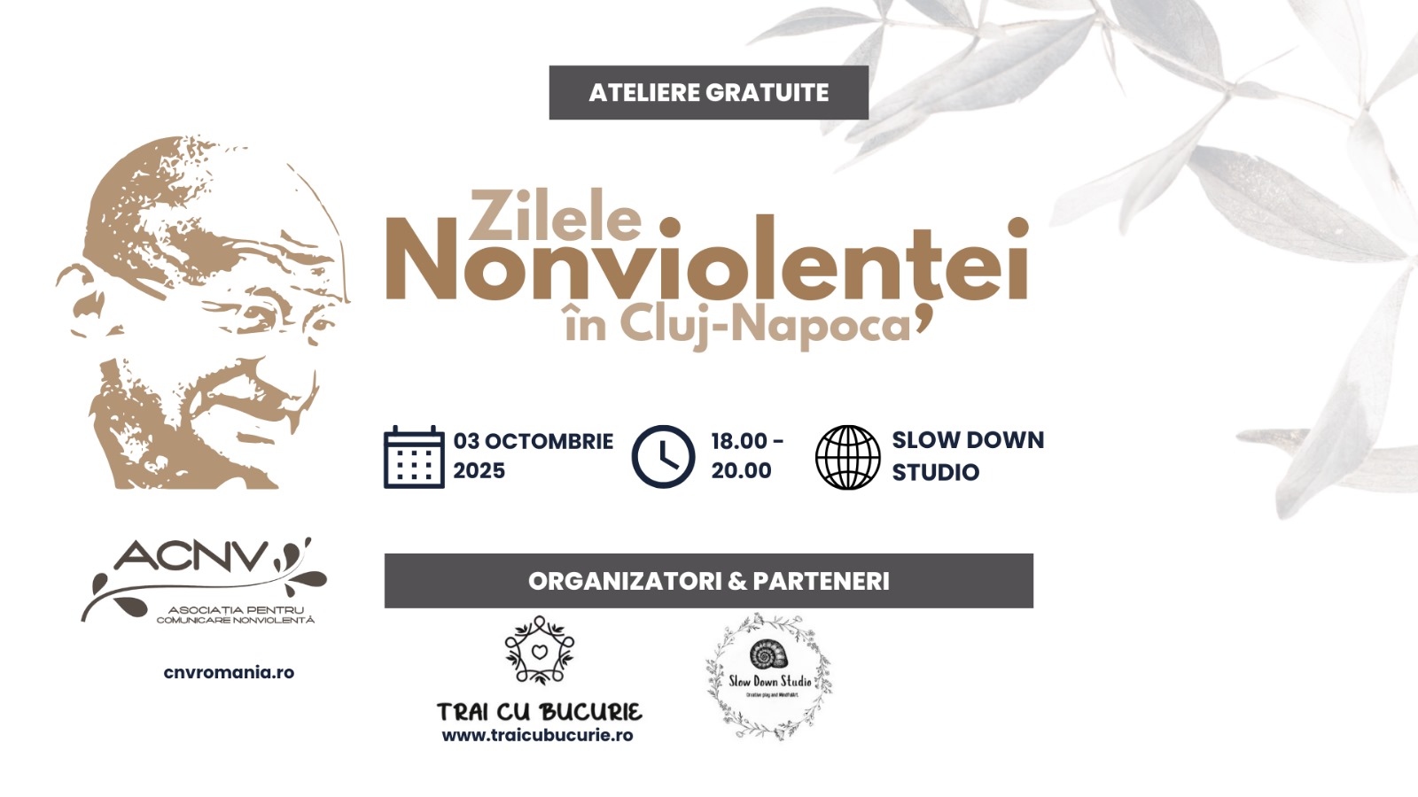 🤍 Zilele Nonviolenței 🤍 La nivel internațional s-a stabilit ziua de 2 octombrie ca fiind Ziua Nonvilenței, în onoarea liderului indian Mahatma Ganghi, care a condul India la independență prin mișcări de rezistență pașnică. Fondatorul Comunicării Nonviolente, Marshall B Rosenberg, s-a născut pe 6 octombrie și si-a inspirat munca și din cunoașteri de psihologie umanistă dar și din activitatea și învățăturile lui Gandhi și alte surse. În România, în mai multe orașe, cu ocazia acestor date, sărbătorim abordarea nonviolentă prin evenimente gratuite organizate sub umbrela Asociația pentru Comunicare Nonviolentă din România.